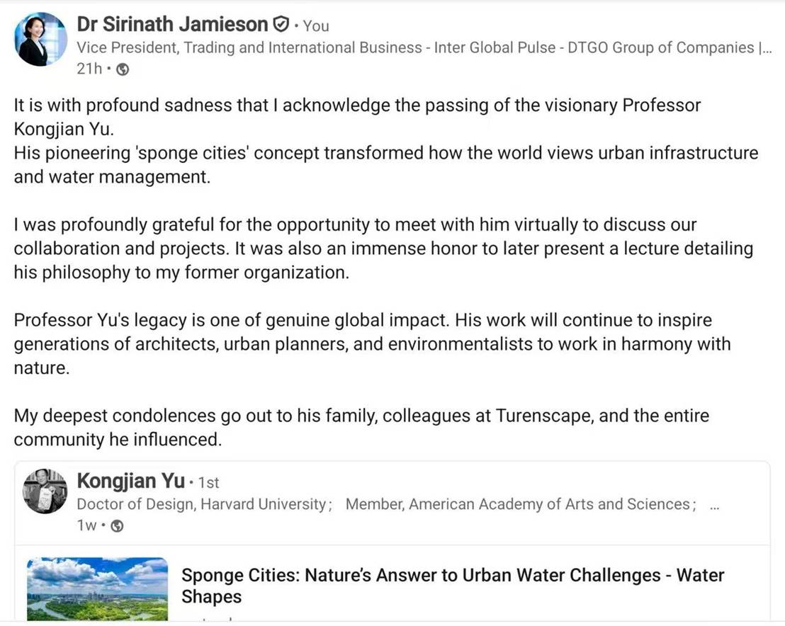 My deepest condolences go out to his family, colleagues at Turenscape, and the entirecommunity he influenced.